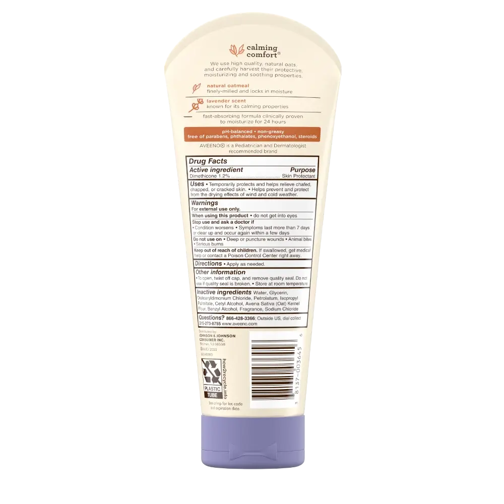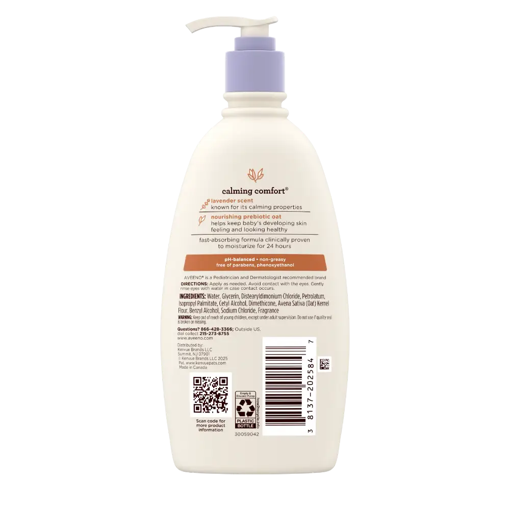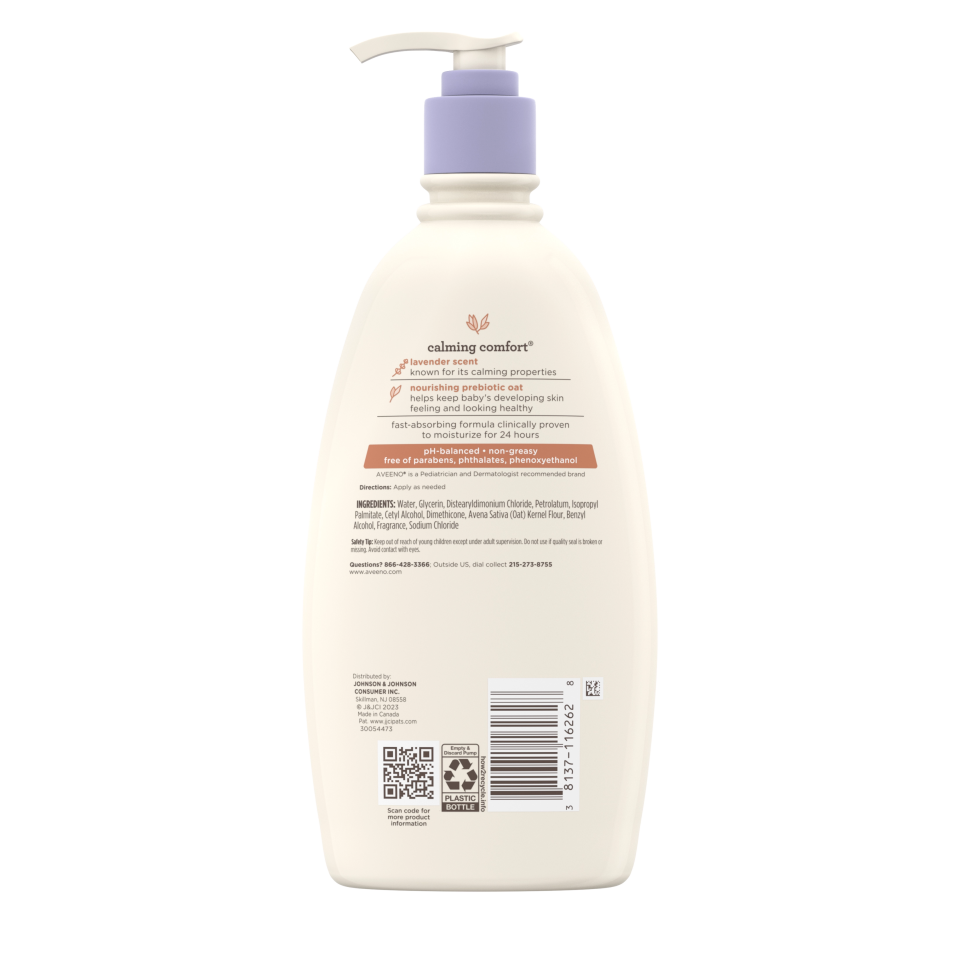 Enriched with oat and scents of lavender and vanilla, this nourishing lotion helps comfort and soothe your little one before bedtime. Gentle on baby’s delicate skin, this lotion moisturizes for a full 24 hours and strengthens skin's natural moisture barrier. It can also be applied to help prevent and temporarily protect chafed, chapped, or cracked skin.
