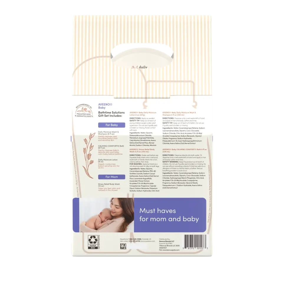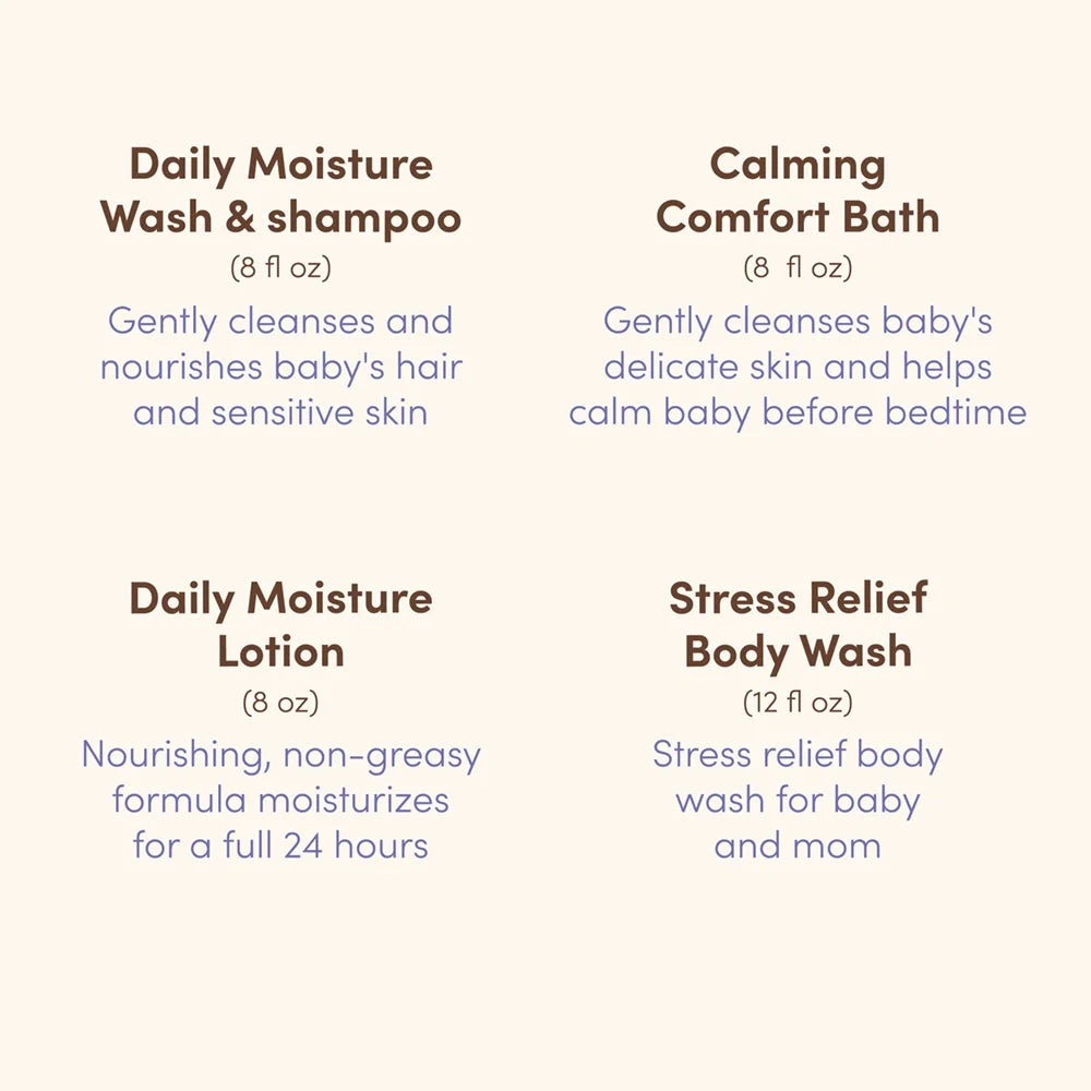 Give your favorite mom everything she needs for a soothing bath time moment with baby. This gift set includes Baby Wash & Shampoo, tear-free Baby CALMING COMFORT- Bath, Baby Daily Moisture Lotion, plus an adult Stress Relief Body Wash because moms deserve pampering, too. Everything is designed for delicate baby’s skin, so it’s a gift moms can feel good about.
