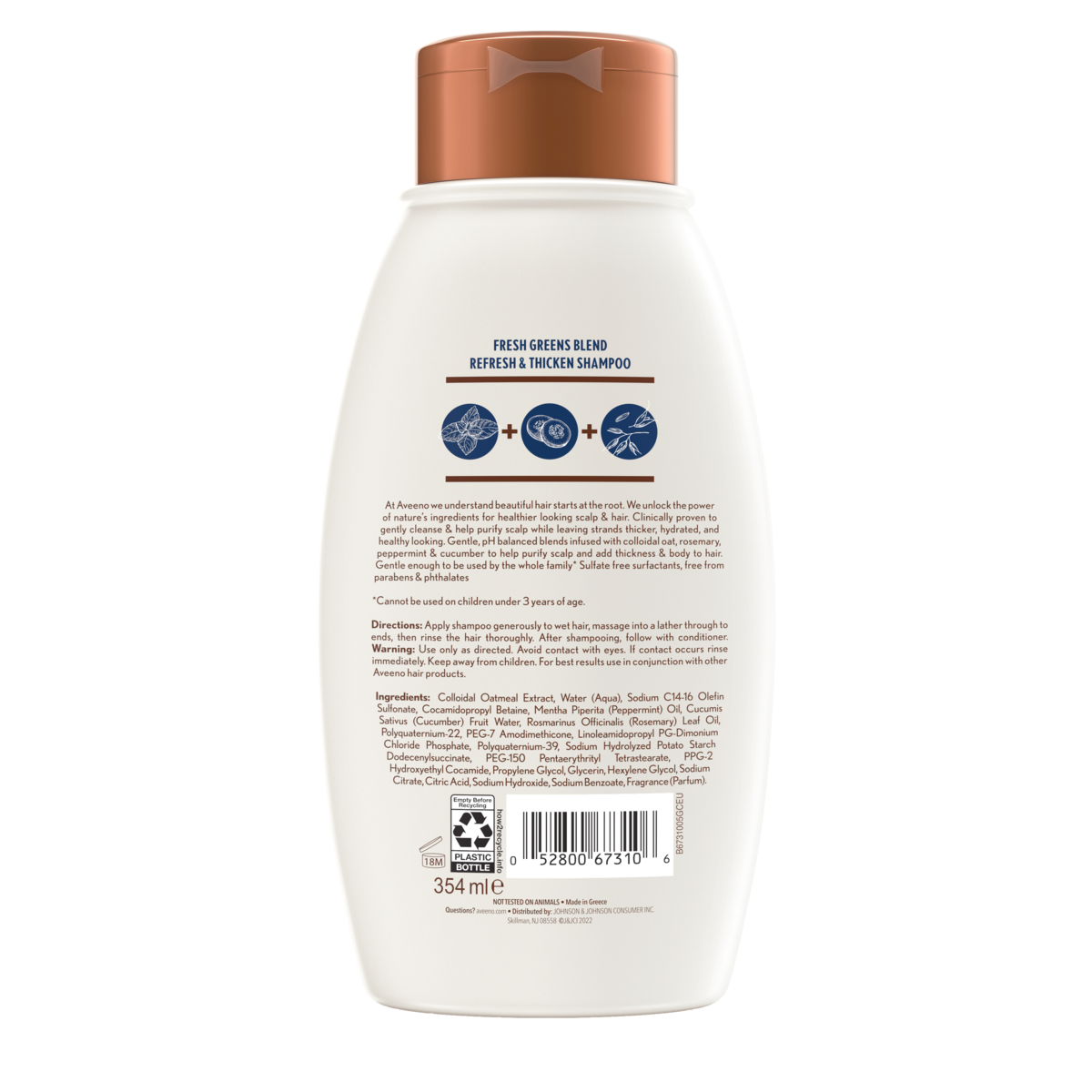 Clarify and volumize your hair with Aveeno® Fresh Green Blend Shampoo. This volumizing shampoo helps promote a healthy scalp while refreshing your strands and adding healthy body to thin hair. Great for fine to medium hair, the fresh greens formula adds body and leaves hair feeling refreshed and naturally nourished. Part of the Aveeno® Scalp Soothing Haircare Collection, this conditioner contains oat as the first ingredient – which is known for its soothing and moisturizing properties. All Aveeno® hair care products are made with balanced blends of wholesome ingredients and are free from sulfates, parabens and dyes.