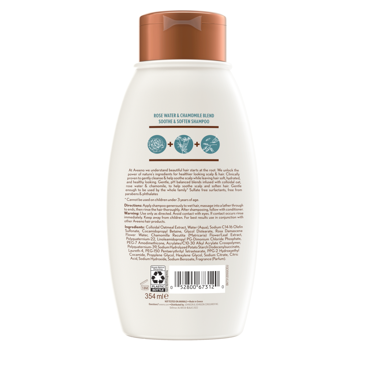 Give dry hair a healthy, bouncy look and a soft-as-a-petal feel with Aveeno® Rose Water & Chamomile Shampoo. This gentle shampoo helps promote a healthy scalp while nourishing dry strands. Great for fine, fragile hair, the rose water and chamomile formula helps soothe scalp and hydrate hair. Part of the Aveeno® Scalp Soothing Haircare Collection, this shampoo contains oat as the first ingredient, which is known for its soothing and moisturizing properties. All Aveeno® hair care products are made with balanced blends of wholesome ingredients and are free from sulfates, parabens and dyes.
